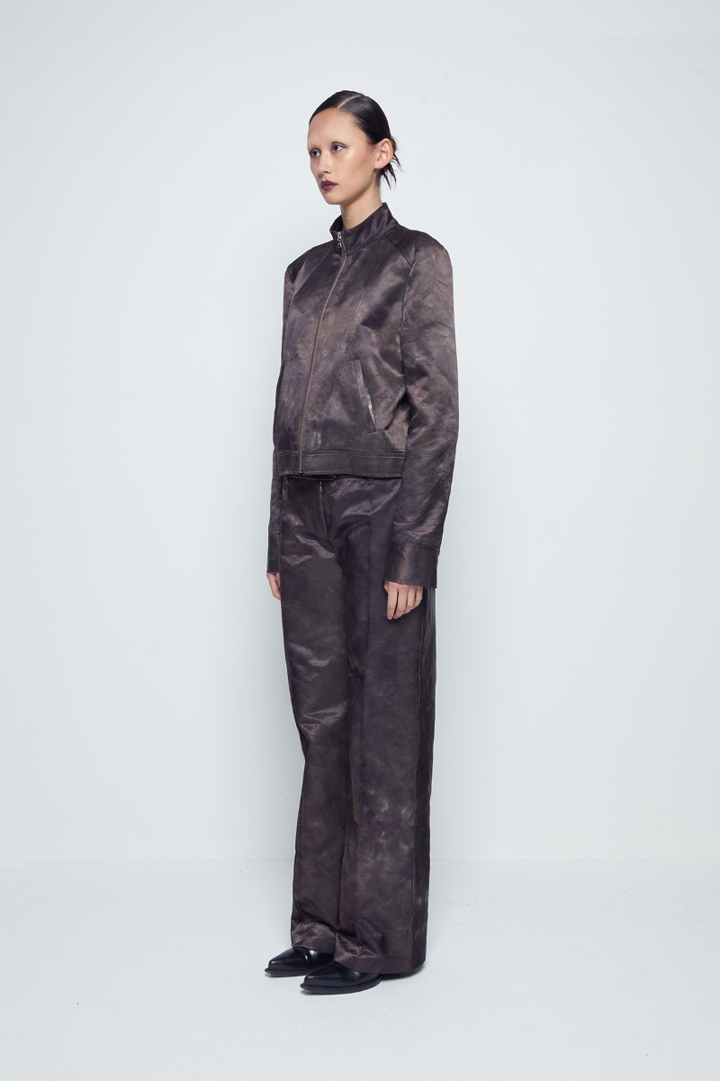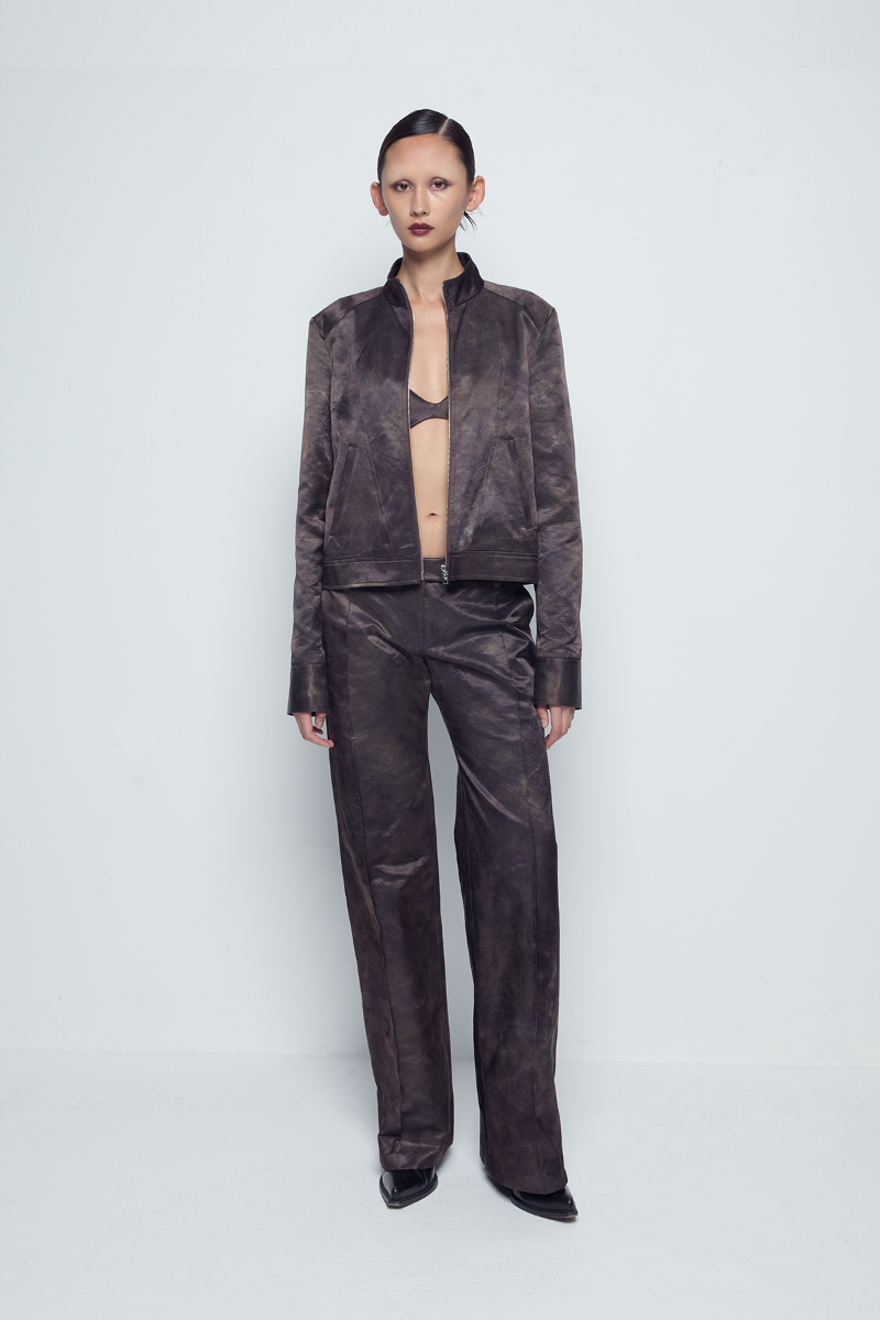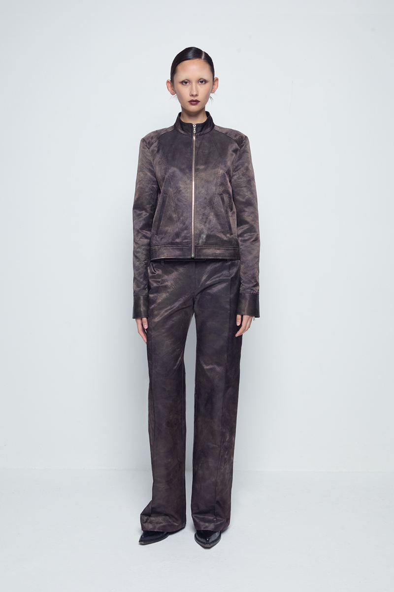 The Shān Jacket is made from a textured cotton rayon satin and features a standing collar with a centre front exposed zip. This mid weight jacket has front and back design lines, side welt pockets and exposed zips on the cuffs. The jacket is fully lined.